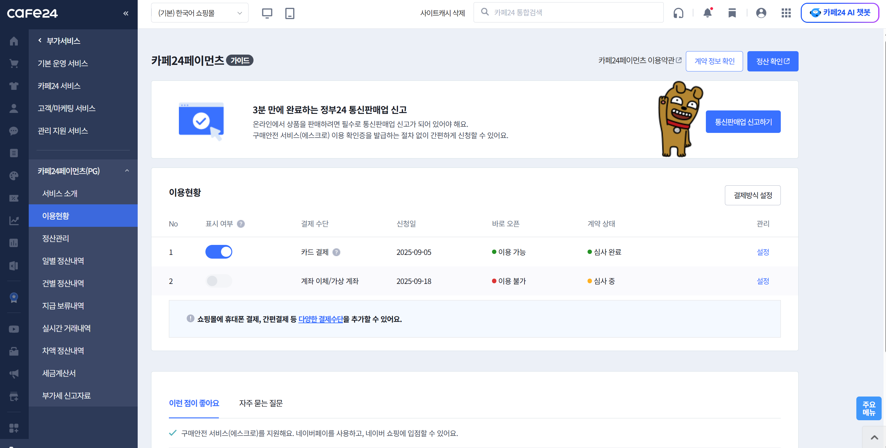 CAFE24 관리자 페이지 > 부가서비스 > 카페24페이먼츠(PG) > 이용현황